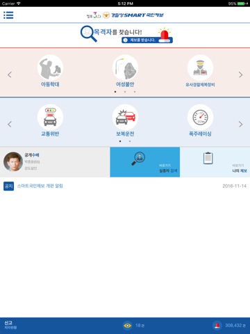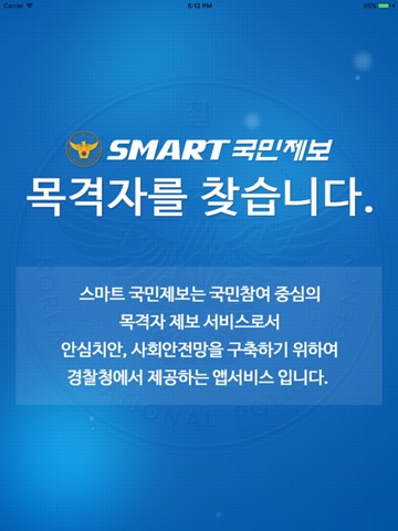 스마트국민제보-목격자를 찾습니다는 우리 주변에서 일어나는 각종 사건, 사고를 손쉽고 간편하게 제보할 수 있는 국민참여형 치안 안전 서비스입니다.