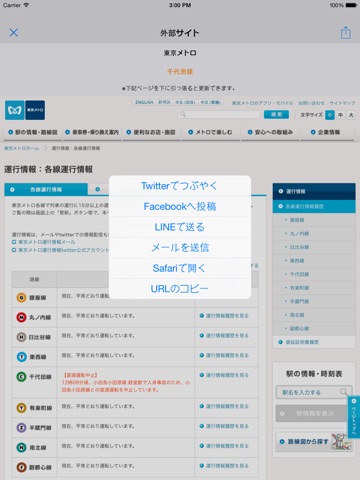 ・遅延情報をTwitterでつぶやいたり、Facebookへ投稿したり、LINEやメールで送ったりと幅広く素早く共有可能。
