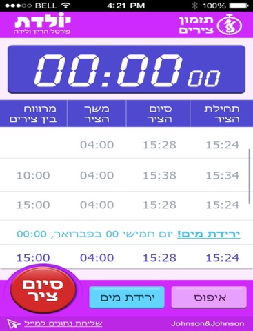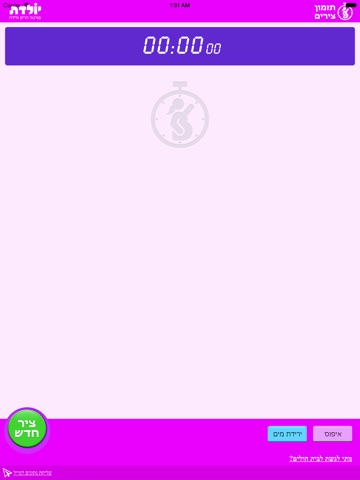 מרכז סיכום עבור תהליך הלידה הכולל טיימר לחישוב זמן הצירים וזמן ירידת המים.