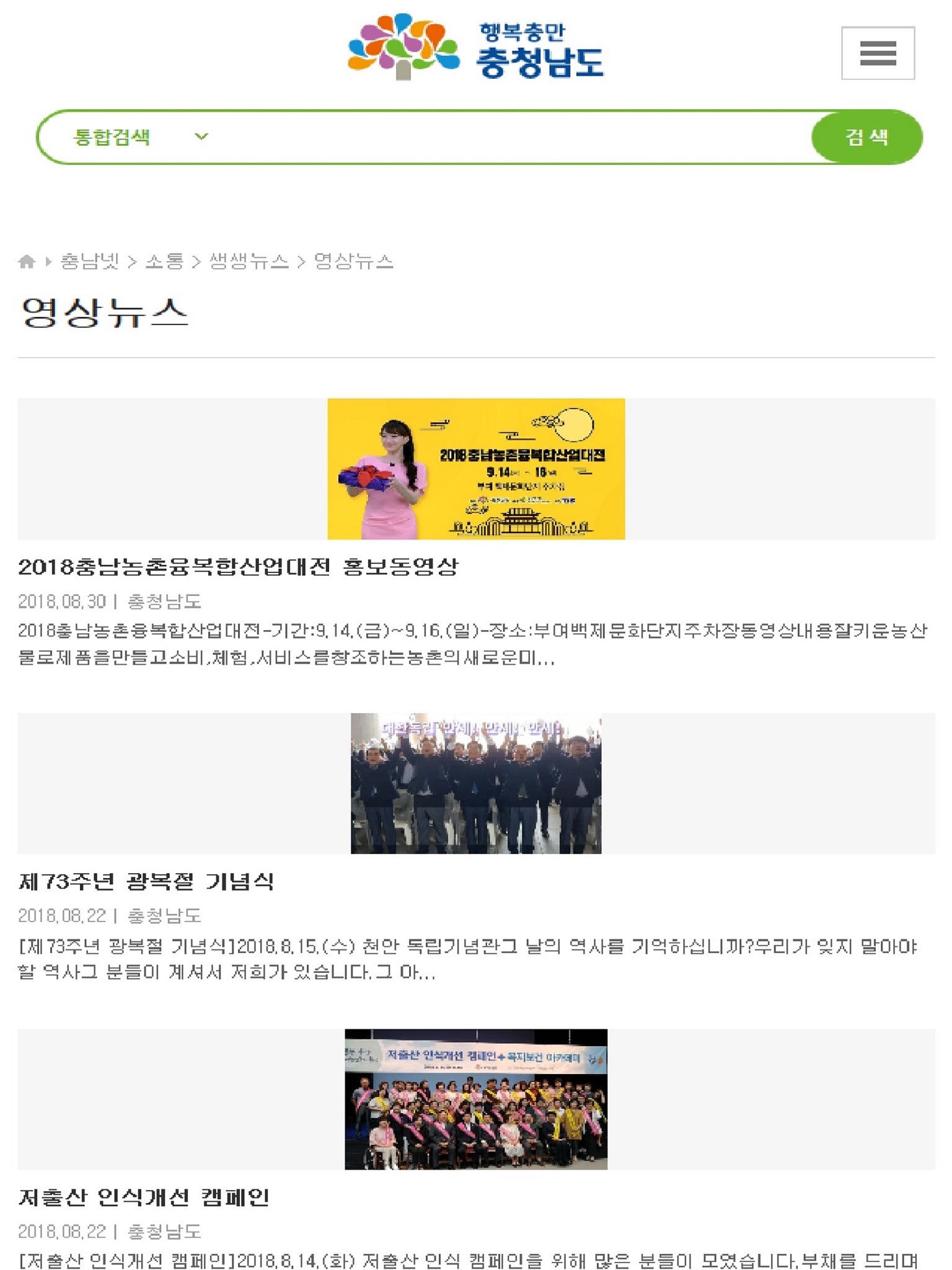 1. 충남소식 : 주요기사, 인기기사, 도민리포터기사, 포토기사 등의 소식을 제공합니다.