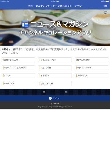 ・SinglePackerはアプリごとにテーマに沿ってさまざまなチャンネルから配信されるRSSをまとめてアプリを作成し、チャンネルキュレーション・アプリとして、みなさまに提供しています。