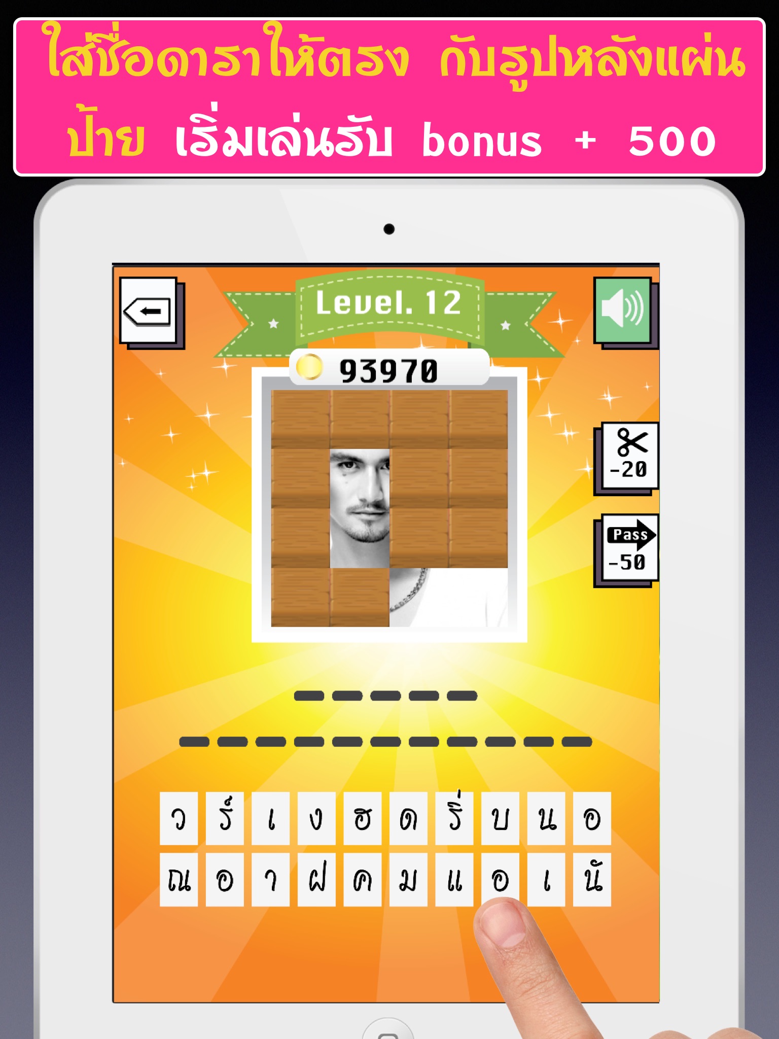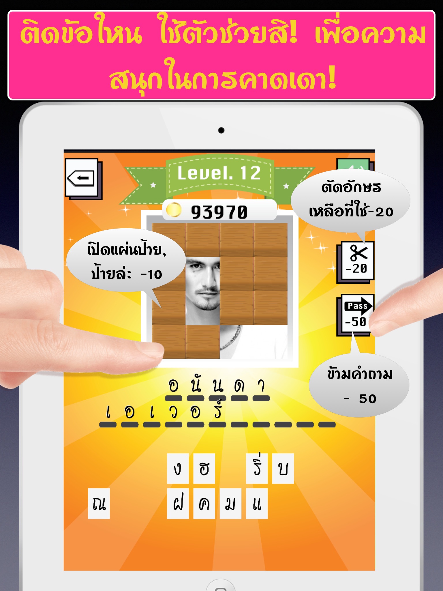 เพียงใส่ชื่อดาราให้ถูกต้อง ตามรูปภาพนั้นๆ ที่ถูกแผ่นปิดไว้บางส่วน เป็นปริศนาให้คาดเดาและทดสอบความจำของคุณ ตอบถูกในแต่ละข้อได้คะแนน +50 ไม่เพียงแค่นั้น คุณยังมีตัวช่วย