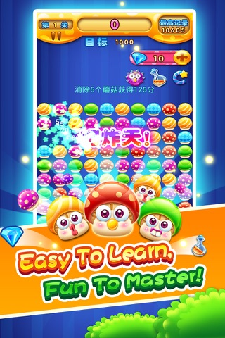 The object of the game is to clear the same color mushrooms. The more mushrooms you clear in a click, the higher your score and the further you can progress in the game !