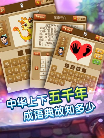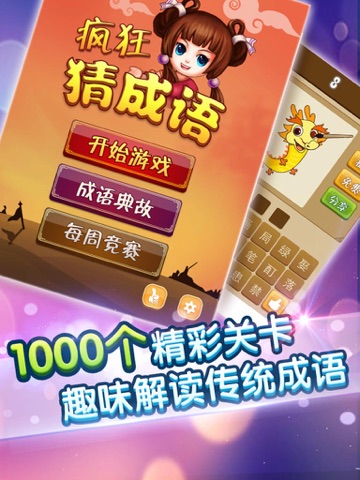 “疯狂猜成语”是一款全中文休闲益智游戏,可以和好友一起体验中国古老文化-成语的魅力,上千关卡等你挑战,让你感受妙趣横生的成语接龙游戏。