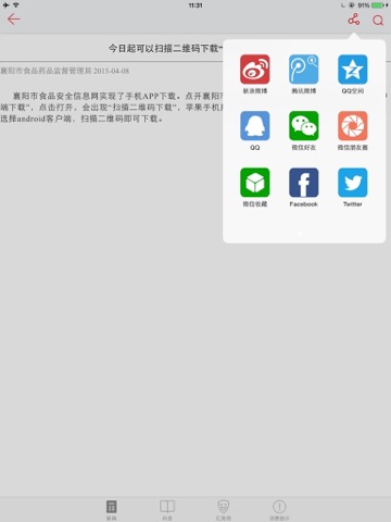 襄阳食事药闻客户端的功能有新闻、科普、红黑榜、消费提示等,主要发布襄阳市内的食品和药品方面的新闻、生活科普知识、食品药品企业的安全情况、消费预警提示以及检测结果公布,让政府工作信息惠民。