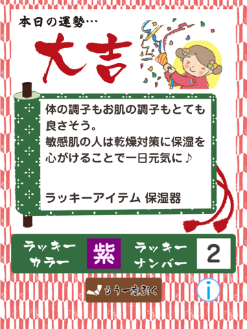 その日の運勢や、健康上のアドバイス、ラッキーカラー&ナンバーなどを、おみくじ形式でご覧いただけます。
