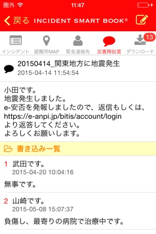 あらかじめ貴社専用のシステム管理画面でグループ別(例:部署別、支店別、役職別等)、インシデント毎(例:地震、パンデミック、等)に手順、ドキュメントといった文章や地図などの画像を貴社の管理者が登録し、必要なコンテンツを必要な社員に配信します。配信時にiPhoneでダウンロードされたコンテンツは端末上に保存されるので、オフライン環境でも参照できます。