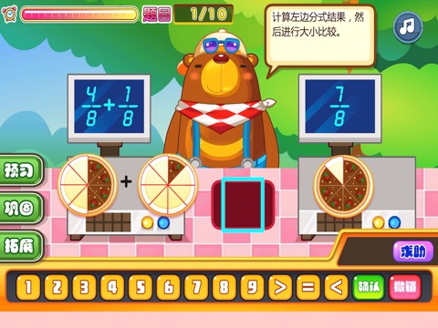 Fractional learning, little friends come together fraction with me. Throug. Through the game of pattern. We choose to fill in the numbers. This game is to let the kids how to know the score. There are three types of the first topic is the understanding of molecular recognition, second kinds of questions is the denominator, third kinds of questions is to recognize fraction phase plus and minus. Through continuous learning to let us know about fractional deeper meaning.