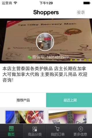 美肤日记,专门为广大用户打造的,该软件包括:首页,首页里面可以查看推荐产品和最近上架,商品分类:可以查看所以的商品,我的订单,可以查看我下过的单,可以买你想要的商品