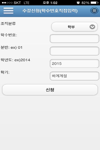 조직분류, 과목번호와 분반을 직접 입력하여 수강신청을한다.
