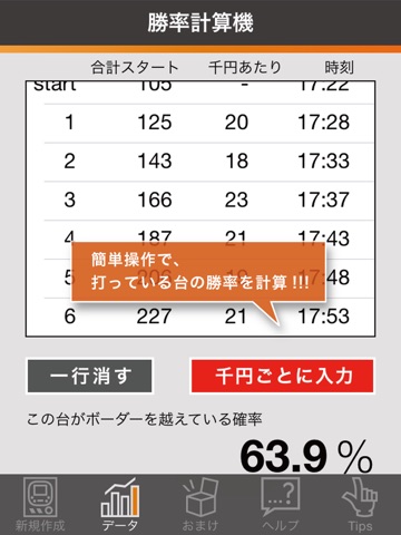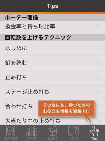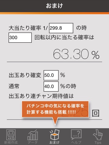 また、打ち方のテクニックや、「あと○○回転で大当たりする確率」などの計算機能も搭載しています。