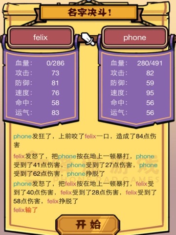 输入您和好友的名字,点击开始后,会根据两者的姓名产生血量、攻击、防御、速度、命中、运气等属性,同时进行相互比拼。