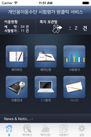 - 예약확인, 예약신청, 시험평가, 이용안내, 1:1문의, 게시판, 이용현황, 쪽지보관함