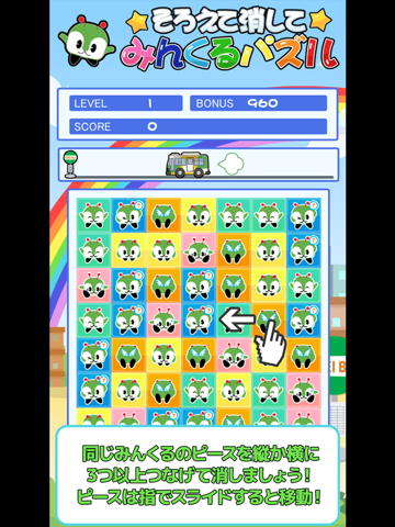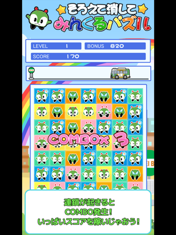 バスがバス停についてしまうとゲームオーバー。みんくるをたくさん消すと時間を稼げるよ。