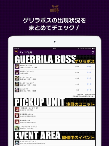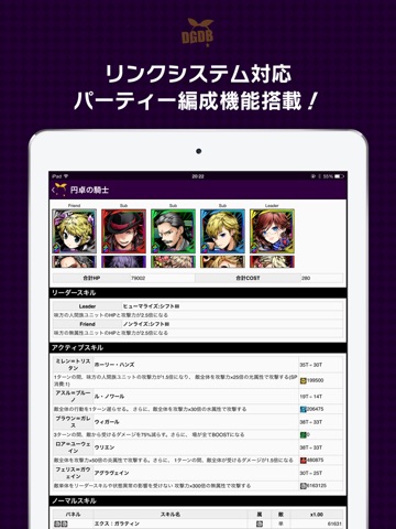 ゲリラボスの出現情報や、全ユニットのステータス・スキル・プロフィール情報はもちろん、パーティーシミュレーターも搭載!