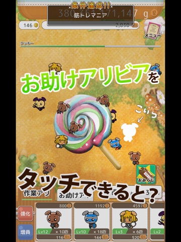 お菓子をクリックしてグラムを貯め、アリビアを強化しましょう。