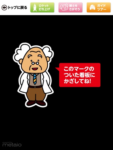 館内の展示物に設置されているマーカーをこのアプリで認識することで「コスモ博士」が、展示物(月面着陸船イーグル号など)の解説を行います。解説は、日本語、英語の2カ国語に対応しています。