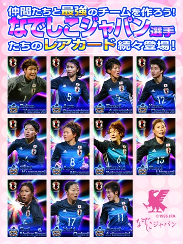 【山下杏也加、鮫島彩、熊谷紗希、市瀬菜々、清水梨紗、宇津木瑠美、阪口夢穂、中島依美、長谷川唯、岩渕真奈、菅澤優衣香】をはじめ多数のサッカー日本女子代表選手が実名実写で登場。手に入れた選手を育てあげ、友達と最強のサッカー日本女子代表チームを作り上げよう。