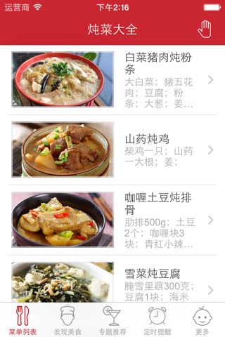 家常炖菜的品种很多,要做出有特色的,就需要根据具体的菜肴去选料,调味,掌握火候,以做到汤鲜味醇, 突出原料自身特点。本APP为你介绍简单易操作的家常炖菜菜谱大全。