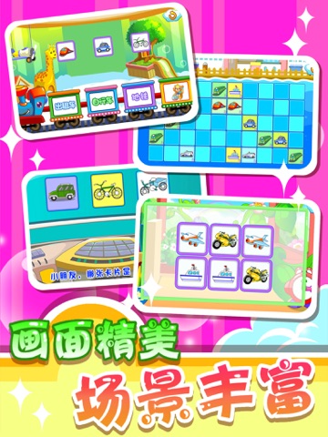 采用寓教于乐的教育方式,让孩子在快乐的游戏中认识各种交通工具,通过反复的游戏加深宝宝的对交通工具的认知。学学乐:通过一幅幅生动有趣的交通工具卡片加上可爱的童声发音,教会宝宝认识各种常见交通工具。考考乐:通过学学乐的学习,宝宝可以在这里来做一些小测验,看看你是否已经认识了这些交通公园。拖拖乐:也是考查宝宝是否认识了这些交通工具一种方式,通过把上方的交通工具卡片拖到对应的相框中来通过关卡。翻翻乐:考查和锻炼宝宝的记忆力,通过连续翻开两种相同的卡片来完成游戏。连连乐:通过连续点击两个连通的相同交通工具图片进行消除,消除完所有图片即算过关。