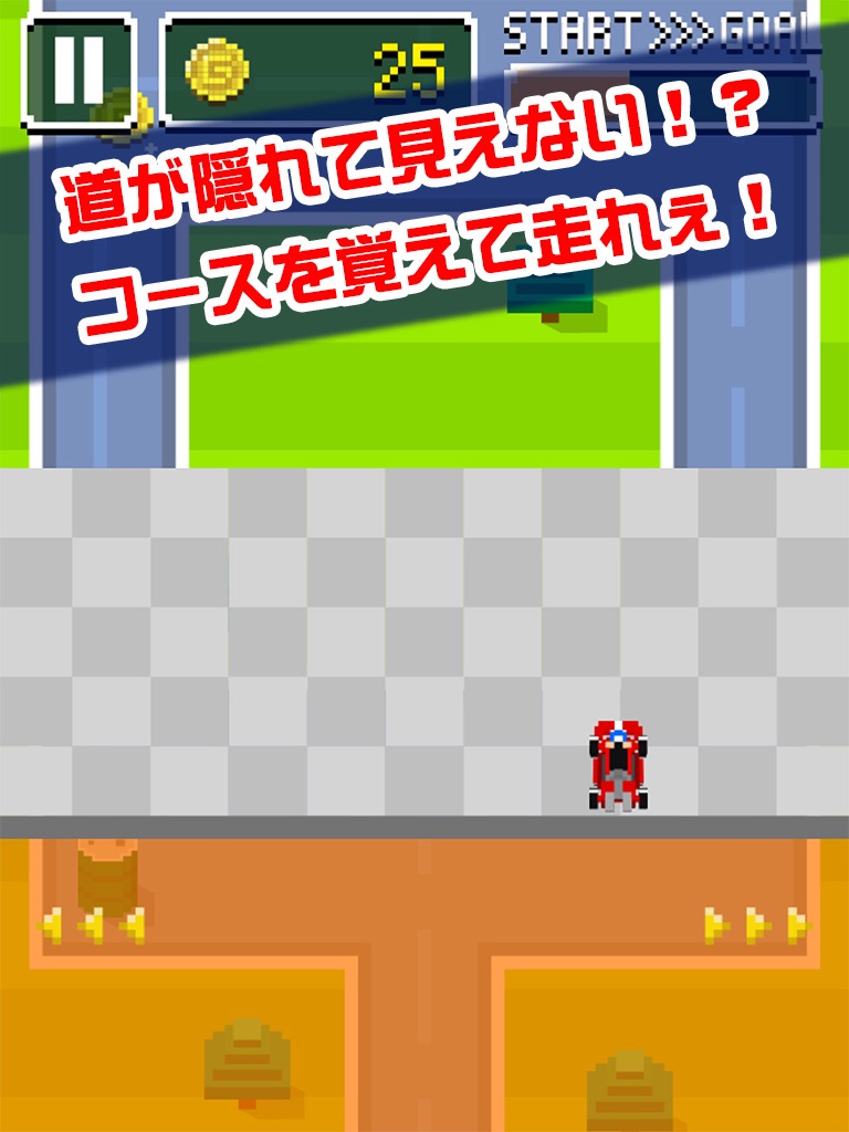 道から外れたり、障害物に当たるとゲームオーバーです。
