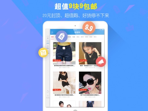 2.每天千余款9.9元包邮商品推荐,数码、男装、女装、家居、母婴、鞋包、配饰、美妆、美食、娱乐、电影,藏不住的诱惑就在九块九包邮!