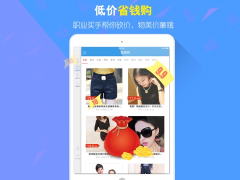 1.淘宝天猫独家合作,同样的质量比价格,我们是最低的,一键把流行带回家。打造全新的9.9元购物生活理念。大家一起聚便宜聚划算哦。
