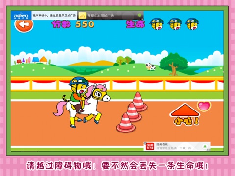 小朋友,一起来照顾可爱的小马吧!为小马喂饲料、洗澡等等。然后就和可爱的小马一起愉快的奔跑了!要小心赛道行突然出现的障碍物哦!如果没有通过障碍物的话就会失掉一条生命哦!