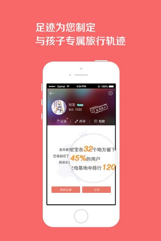 亲子足迹是一个以亲子景点点评、亲子活动分享为核心的家庭亲子出行平台。在这里可以分享查看别人带宝宝出行的攻略心得,也可以查找报名各种亲子、展览等活动,让您带宝宝说走就走;同时,收录您跟孩子的专属旅行轨迹,留下属于你们的足迹。