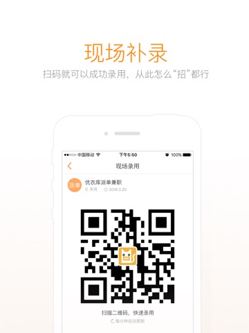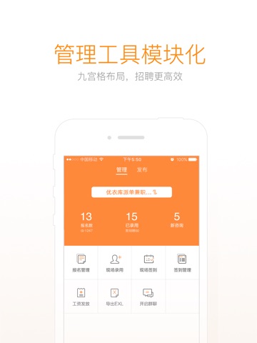 【管理方便】查看兼职简历,群聊实时沟通,现场一键录用,人员批量签到,线上结算更快捷。