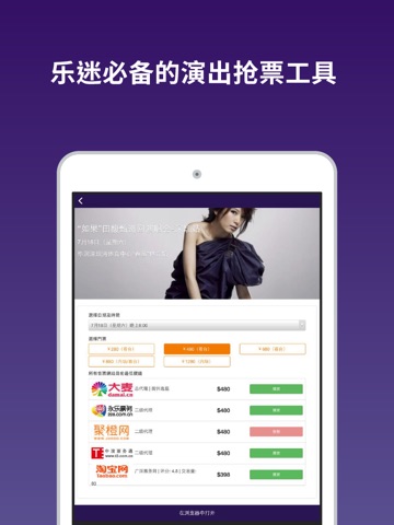 ▸ 比较各大售票网价格及销售状况,包括大麦、永乐、聚橙、中演和淘宝,以及香港的快达票、购票通、城市电脑售票网