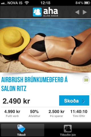 Aha appið gerir viðskiptavinum aha.is kleift að kaupa tilboð með snjallsímanum, fylgjast með pöntunum og halda utan um inneignarmiða hjá aha.is.