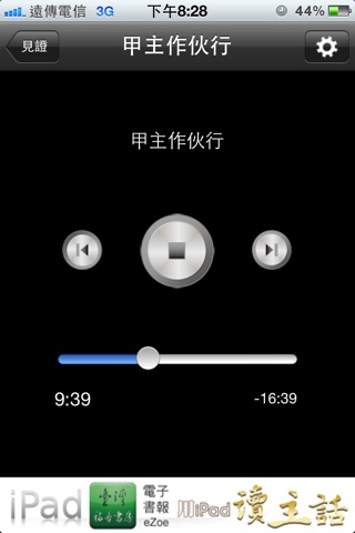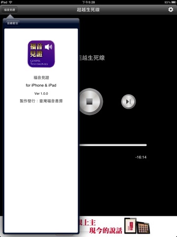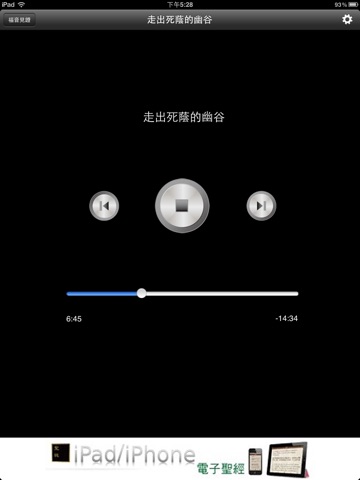 说明:此APP为云端版本,默认为『联机模式』,需上网播放。针对特殊需要,另有提供『下载模式』,请至此APP『设定页面』进行调整,即可脱机播放。此APP支持iPhone 5长萤幕, iPad的空气及iPad的mini等设备屏幕显示,并支持耳机麦克风线控功能,包含音量大小声控制,暂停、播放控制。另外,支持背景连续播放,即使屏幕自动锁定后,仍可连续播放。任何使用上的问题,欢迎来信:[email protected],会有专人为你服务、解答。