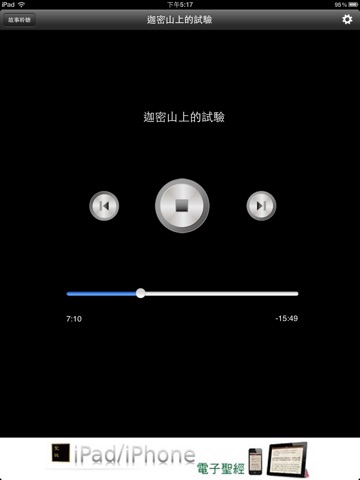 说明:此APP为云端版本,默认为『联机模式』,需上网播放。针对特殊需要,另有提供『下载模式』,请至此APP『设定页面』进行调整,即可脱机播放。此APP支持iPhone 5长萤幕,iPad的空气及iPad的 mini等设备屏幕显示,并支持耳机麦克风线控功能,包含音量大小声控制,暂停、播放控制。另外,支持背景连续播放,即使屏幕自动锁定后,仍可连续播放。任何使用上的问题,欢迎来信:[email protected],会有专人为你服务、解答。