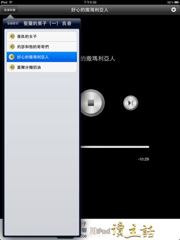 『故事聆听』有声APP收录台湾福音书房所发行之儿童教材有声书,包含《儿童故事》、《圣灵的果子(一)良善》、《神圣的律法》、《手套露露的故事》、《当我是个小小婴孩》等32则有声故事,适用于iPhone智能型手机及iPad平板计算机。