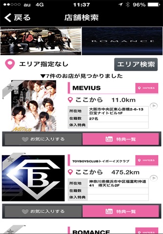 お気に入り登録をしているホストクラブ・ホストの情報が今いる場所から順に表示されます。
