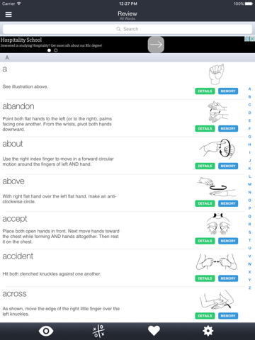 Note: This is the Ads supported version of the ASL application for iPhone platform from Zoosware. This version is free for you to download and there are 1400 words for review. Learning the American Sign Language (ASL) now becomes easier and enjoyable with ASL for Apple iPhone/iPod Touch from Zoosware. You can easily at your own pace do a revision of the American Sign Language. ASL for Apple iPhone/iPod Touch allows you to review the American Sign Language vocabulary. The ASL signs have descriptions and memories which can be reviewed. You can use the search feature to easily locate your requested signs. Also included in this application, a feature that would definitely lighten things up when it gets too tiring after doing all the review - Quiz! With the Quiz feature, you can always have an enjoyable time while learning the ASL on your Apple iPhone/iPod Touch. Learning the American Sign Language (ASL) would now becomes easier with these software from Zooware. No matter where you are, you can slowly and gradually familiarise with the vocabulary of the ASL.