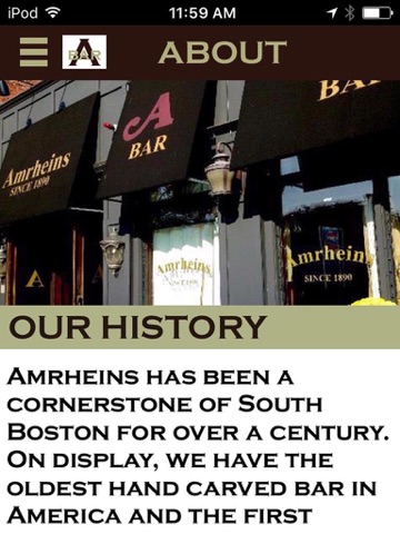 A Bar is the hottest bar in Boston’s Southie neighborhood. This App offers full access to menus, photos and latest news. The app also is the only way to receive fantastic promotions offering discounts and specials. A Bar is located at Amrheins restaurant. Amrheins has been a cornerstone of South Boston for over a century. On display, is the oldest hand carved bar in America and the first draft beer pump in Boston. Traditional style dishes stand the test of time through the changing dinning trends. Amrheins prides itself on providing guests with exceptional cuisine, superior hospitality, and an experience you will not find anywhere else in the neighbourhood.