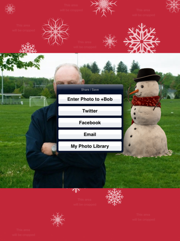 Pinch and zoom, rotate and move Bob until he looks perfect in your photo. The upload to Facebook, email your friends or save to your photo library.