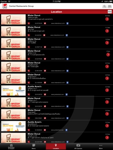 - Location ใช้ค้นหาตำแหน่งร้านหรือสาขาที่อยู่ใกล้ที่สุด พร้อมทั้งแสดงข้อมูลของสาขา