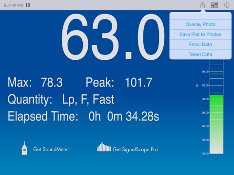 dB turns your iOS device into a simple sound level meter. With it, you can tag the moments of your life -- the big game, standing on a mountain peak, or your best friends wedding -- in a unique, new way. Getting started is as simple as tapping the app icon in the Home Screen to launch the app. Easily tag your moment with the current sound level, and share it with your friends and family, or the world, via email or Twitter.