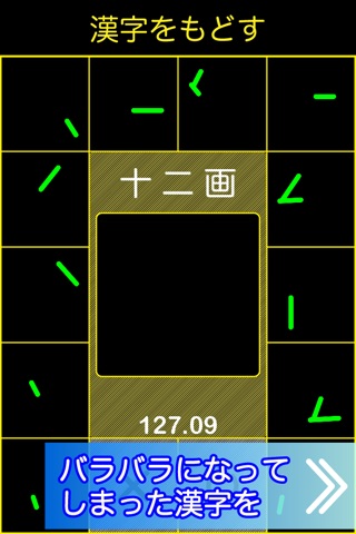 1画から12画まで、バラバラになった漢字の一筆一筆を、筆順通りに素早く漢字に戻すタイムアタック。