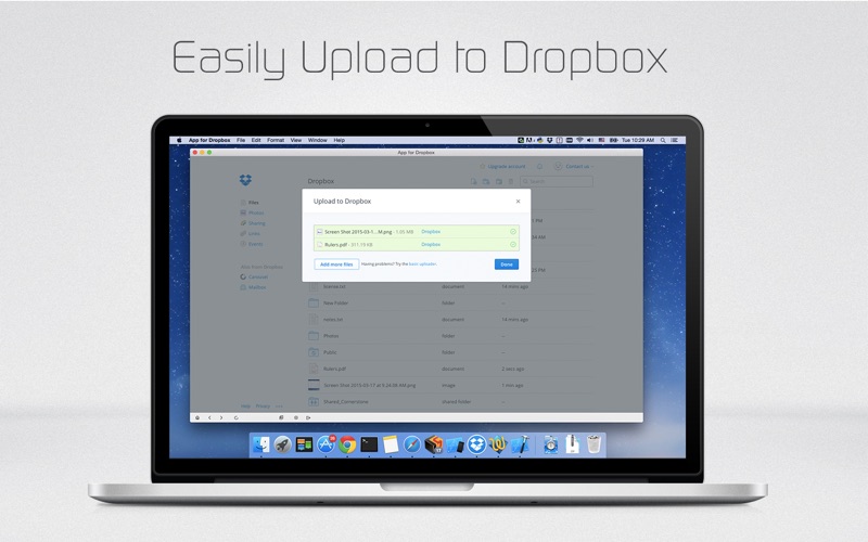 Drop for Dropbox Le logiciel est adapté avec les Mac , cela doit être corectement utilisable Je l’avals télechaeger via internet de la part de la société Dropbox même et App Store me l’a bloqué …..Car je dois passer via Apple Mais j’attend ma livraison qui commence à tarder ………..