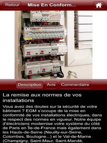 Lapplication "EGM" vous offre la possibilité de consulter toutes les infos utiles de l’électricien (Tarifs, prestations, avis…) mais aussi de recevoir leurs dernières News ou Flyers sous forme de notifications Push.