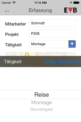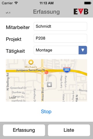 Mithilfe der EVB App können Arbeitszeiten von Mitarbeitern projekt- und personenbezogen erfasst werden. Neben Projekt und Mitarbeitername werden die Anfangs- und Endzeiten sowie der Ort per GPS erfasst. Die Daten werden am darauffolgenden Tag per Email im CSV-Format versendet.