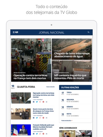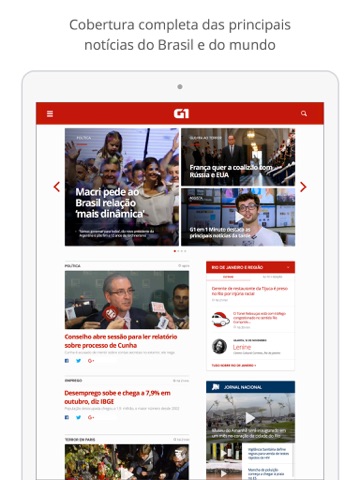 O App registra a sua região garantindo um acesso instantâneo às notícias, vídeos dos telejornais locais e os fatos relevantes da sua cidade e região com coberturas exclusivas do g1.