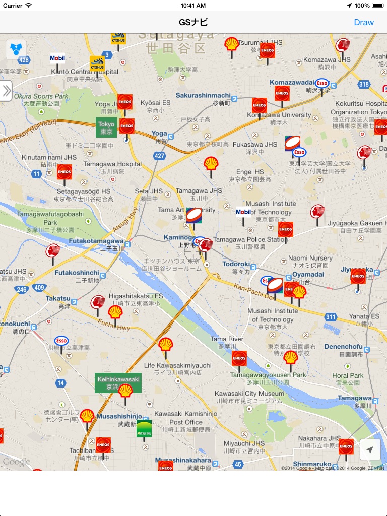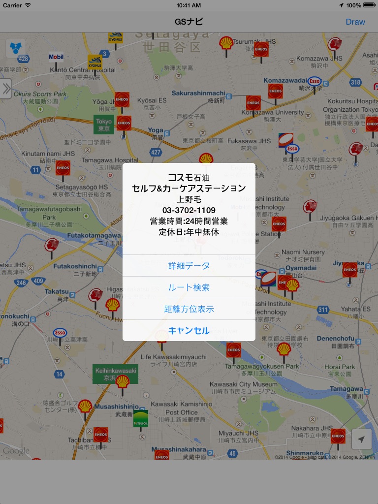 ガソリンスタンドの位置情報などを地図上に表示するアプリです。