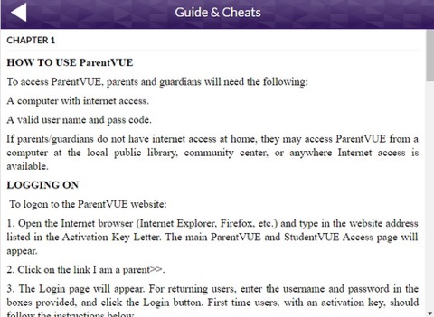 ParentVUE is a secure web-based information management system that is password protected and provides parents/guardians the ability to view their child’s assignments, grades, attendance and contact information. ParentVUE provides parents with an opportunity to review their students course progress and assists parents in the monitoring of their childs educational progress by allowing parents to opt in for automatic notifications for the following: