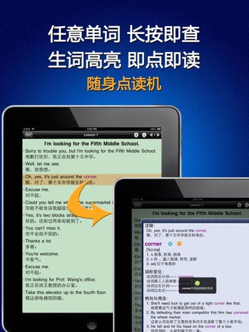 《生活在美国》的每个句子都有标准的真人读音, 英汉对照, 即点即读. 文中每个英文单词都有详细的解释, 音标, 发音以及例句用法, 在阅读的时候只需在任意单词上长按超过一秒钟, 即可查阅, 即点即译, 真正做到哪里不懂点哪里.