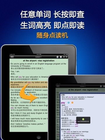 《游学美国》的每个句子都有标准的真人读音, 英汉对照, 即点即读. 文中每个英文单词都有详细的解释, 音标, 发音以及例句用法, 在阅读的时候只需在任意单词上长按超过一秒钟, 即可查阅, 即点即译, 真正做到哪里不懂点哪里.